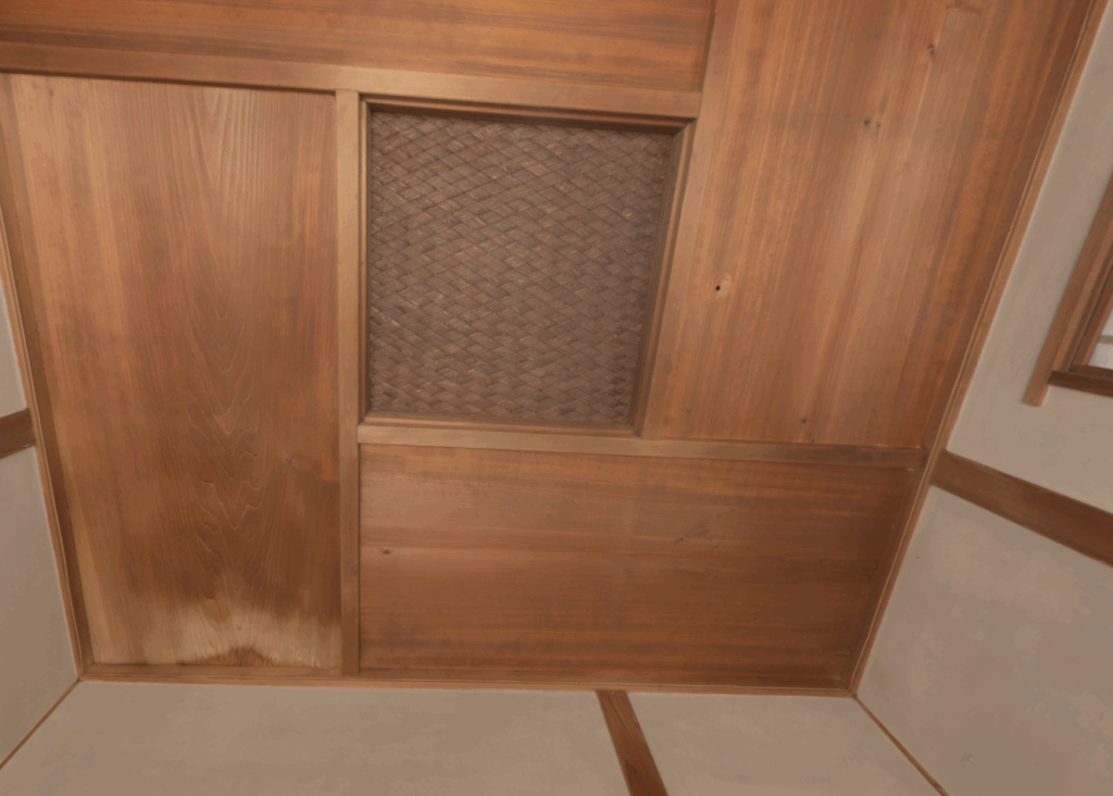 天井は一枚ものの杉板が使わていて、真ん中は網代組という杉板を編んだ仕上げで、通気できるようになっているそうです。