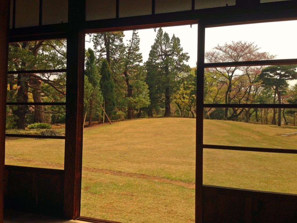 客間の窓の外には広大な庭が広がっているんですが、眺めていると「この庭は和洋折衷なんですよ」とガイドさん。