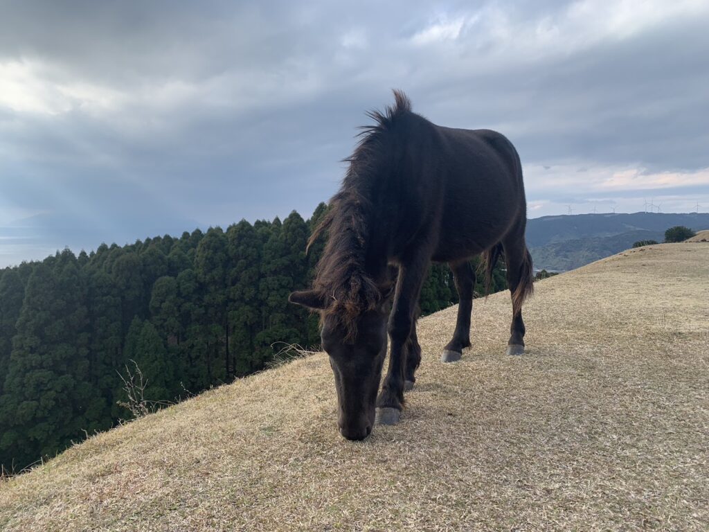 都井岬は野生の馬が生息している地域で、そこらへんで馬が自由に草を食べています。