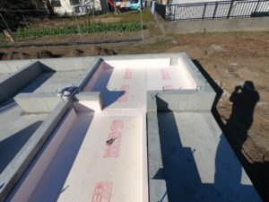 玄関とシューズインクロークは土間になっていて、木造の床がありません。コンクリートの土間の上にタイルを貼る仕様になるので、先行して断熱しておくんですねー。
