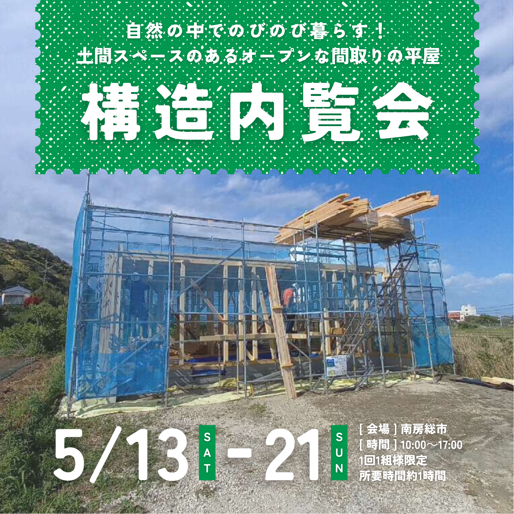 南房総市の田園風景の中にたたずむ平屋が構造内覧会の会場です。コンパクトな見た目ながら、大人も子どもも家族みんながのびのびと暮らせるオープンで自由な空間作りと、それらを叶える高気密・高断熱・高耐震の構造がよく分かるイベントとなっています✨