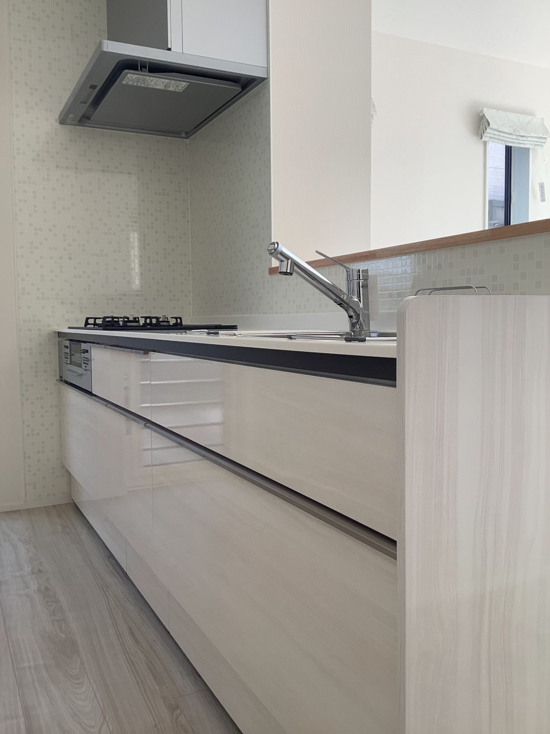 壁面には淡いベージュのタイル柄キッチンパネルを採用し、清潔感のある仕上がりに。