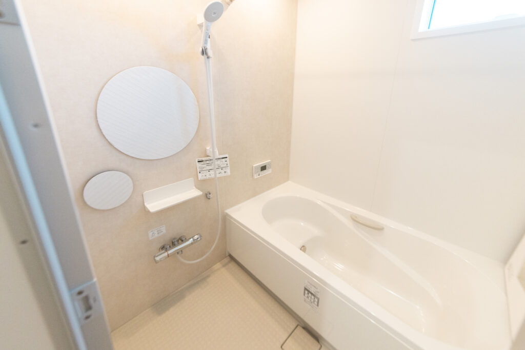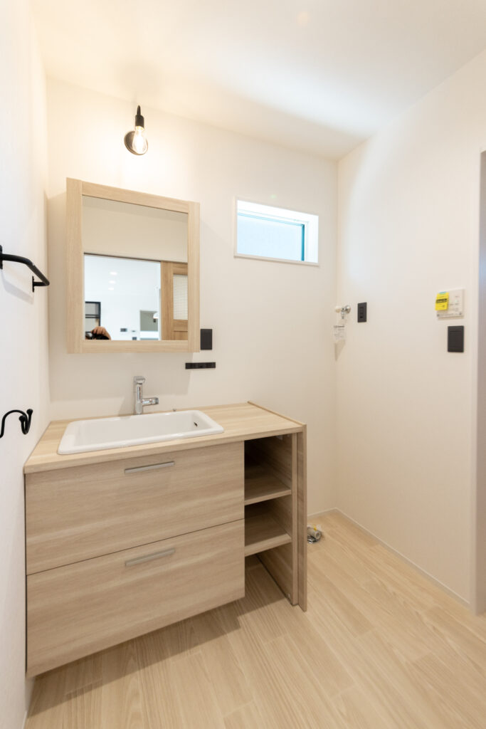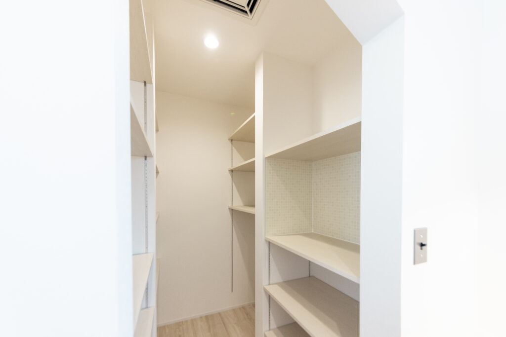 収納力たっぷりのパントリーや家事動線上に設けた収納棚、丸い鏡が印象的な浴室など、