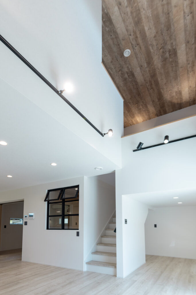 開放感あふれる吹き抜け天井には、木の風合いを感じさせるクロスを採用。