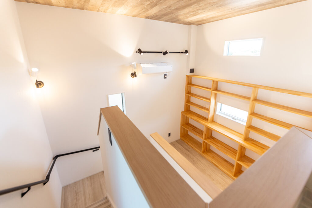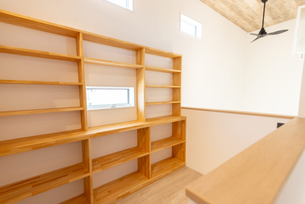 スキップフロアには、吹き抜けに面した造作本棚を設け、