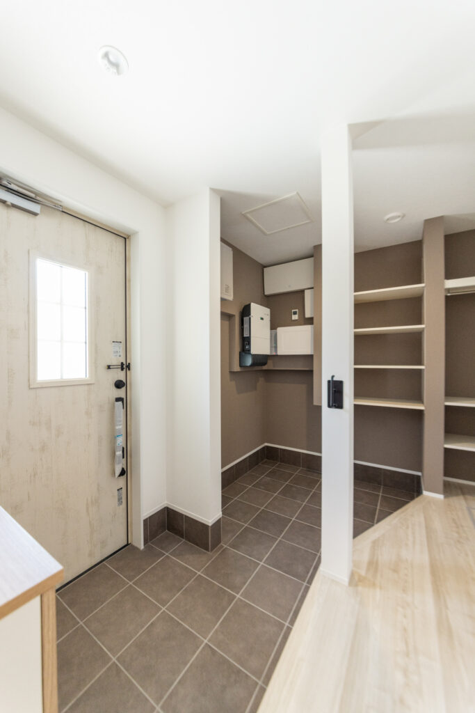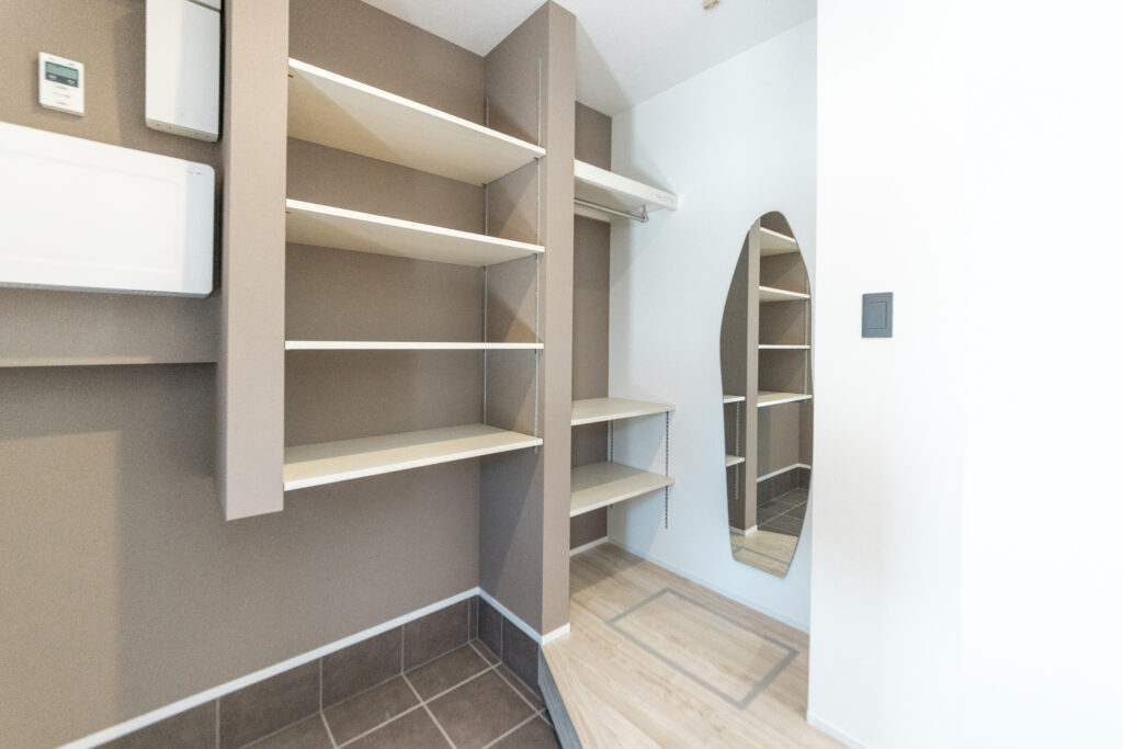 玄関にはアウトドア用品も収納できる大型のクロークに、外出時に役立つお洒落な鏡も設置。