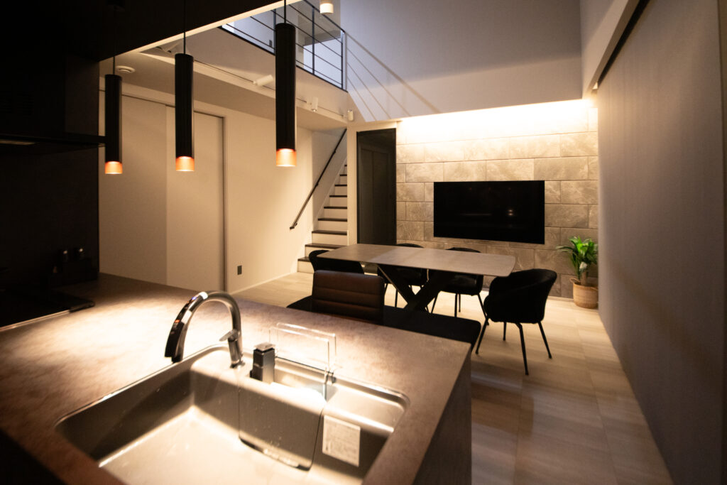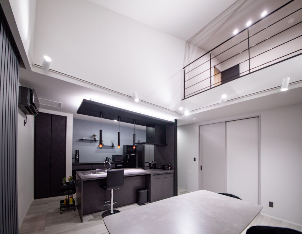LDKは勾配天井と間接照明で開放感とホテルライクな落ち着きを両立。